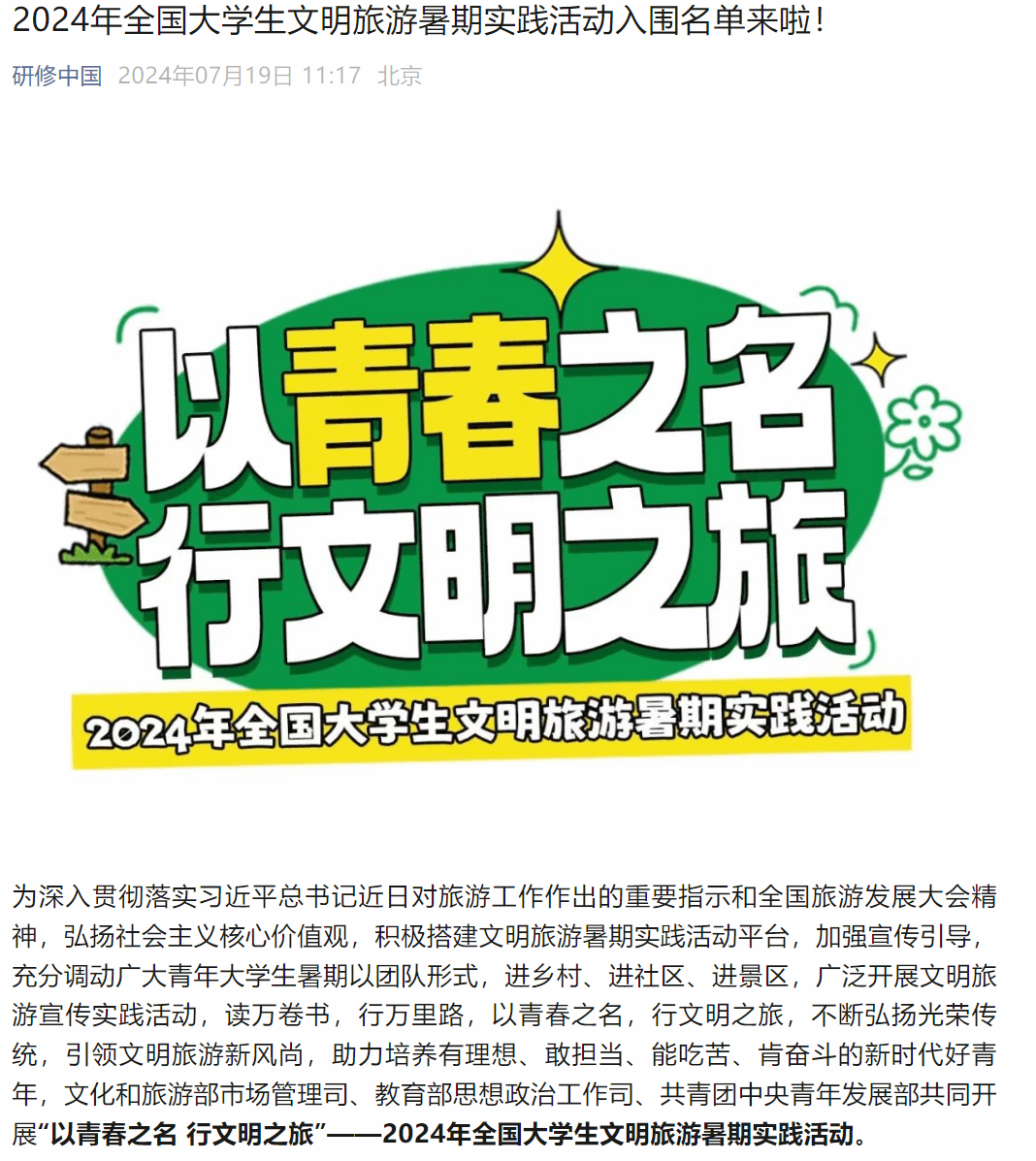 “以青春之名 行文明之旅”——2024年全国大学生文明旅游暑期实践活动启动以来,共有来自全国550所高校的1750支大学生实践团队报名参与,报名团队覆盖全国31个省、自治区、直辖市,报名学校涵盖重点大学、普通院校、高职院校等国内各层级院校。经过组织方多轮审议,最终推荐300支大学生实践团队进入2024年全国大学生文明旅游暑期实践活动名单。“‘美丽中国 青春建功’长江大保护专项活动”发布以来,得到了省内各高校的广泛关注和积极参与,最终遴选确定了100支“美丽中国 青春建功”长江大保护工作专项重点实践团队。
