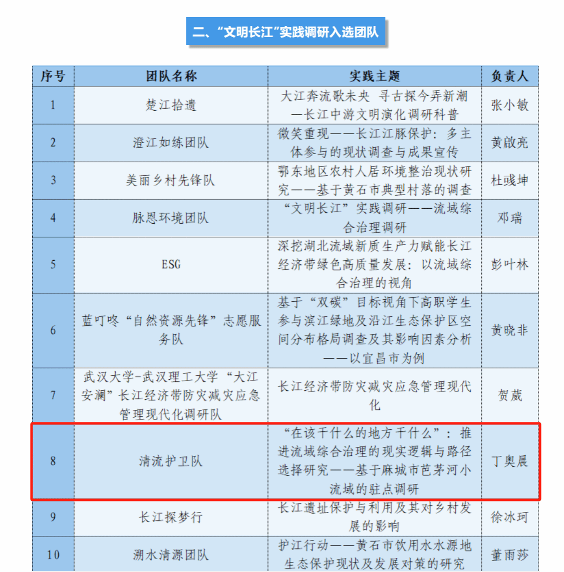 为深入学习宣传贯彻习近平新时代中国特色社会主义思想和党的二十大精神,全面贯彻落实习近平生态文明思想和习近平总书记关于推动长江经济带高质量发展重要论述精神,引导和帮助广大青年学生上好“行走的思政课”和“一线的专业课”,近日,由文化和旅游部市场管理司、教育部思想政治工作司、共青团中央青年发展部联合举办的“‘以青春之名 行文明之旅’——2024年全国大学生文明旅游暑期实践活动”和由团湖北省委指导、中国地质大学(武汉)团委组织的“‘美丽中国 青春建功’长江大保护专项活动”陆续公布了立项名单,我院研究生暑期社会实践团队“清流护卫队”分别入选。