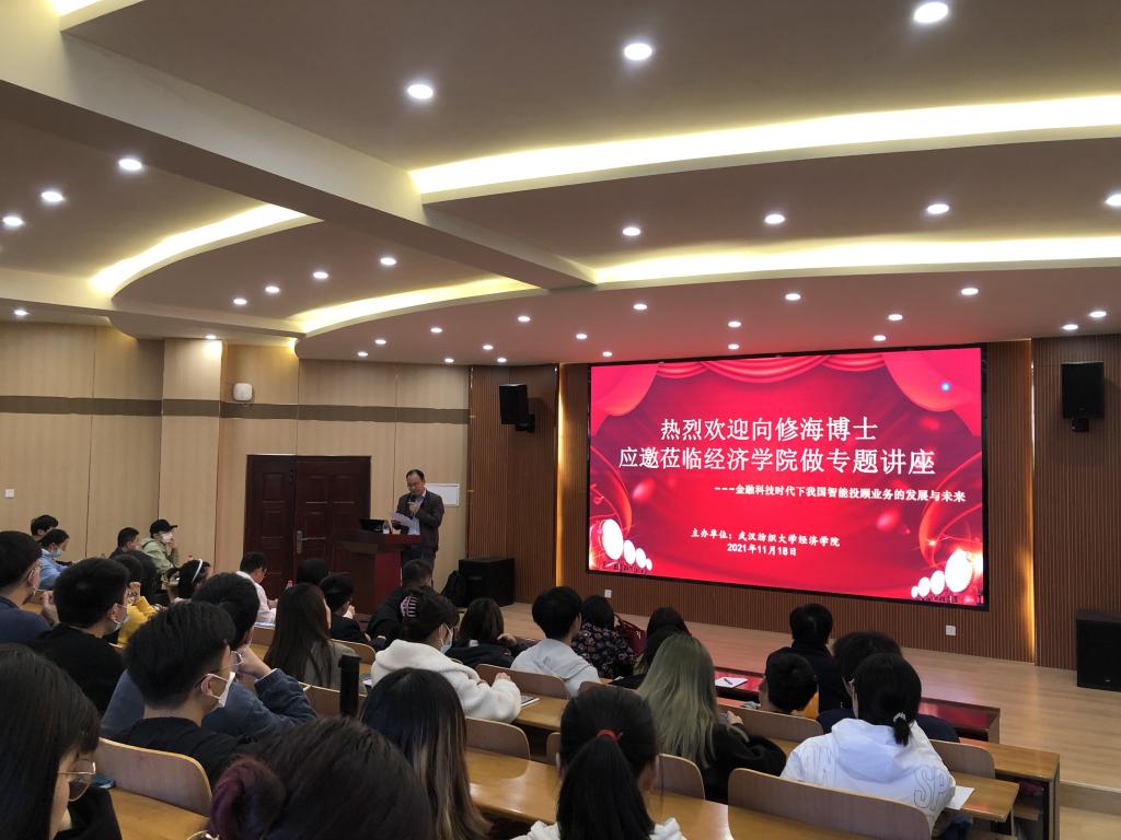 11月18日下午,华中科技大学数量经济学博士、中国金融期货交易所和复旦大学联合培养博士后、优品科技有限公司首席策略管向修海博士应邀来1066vip威尼斯以《金融科技时代下我国智能投顾业务的发展与未来》为题开展讲座,1066vip威尼斯院长段丁强教授、副院长倪武帆教授、研究生导师代表以及全体研究生和部分本科生参加了本次讲座,讲座由1066vip威尼斯院长段丁强教授主持。