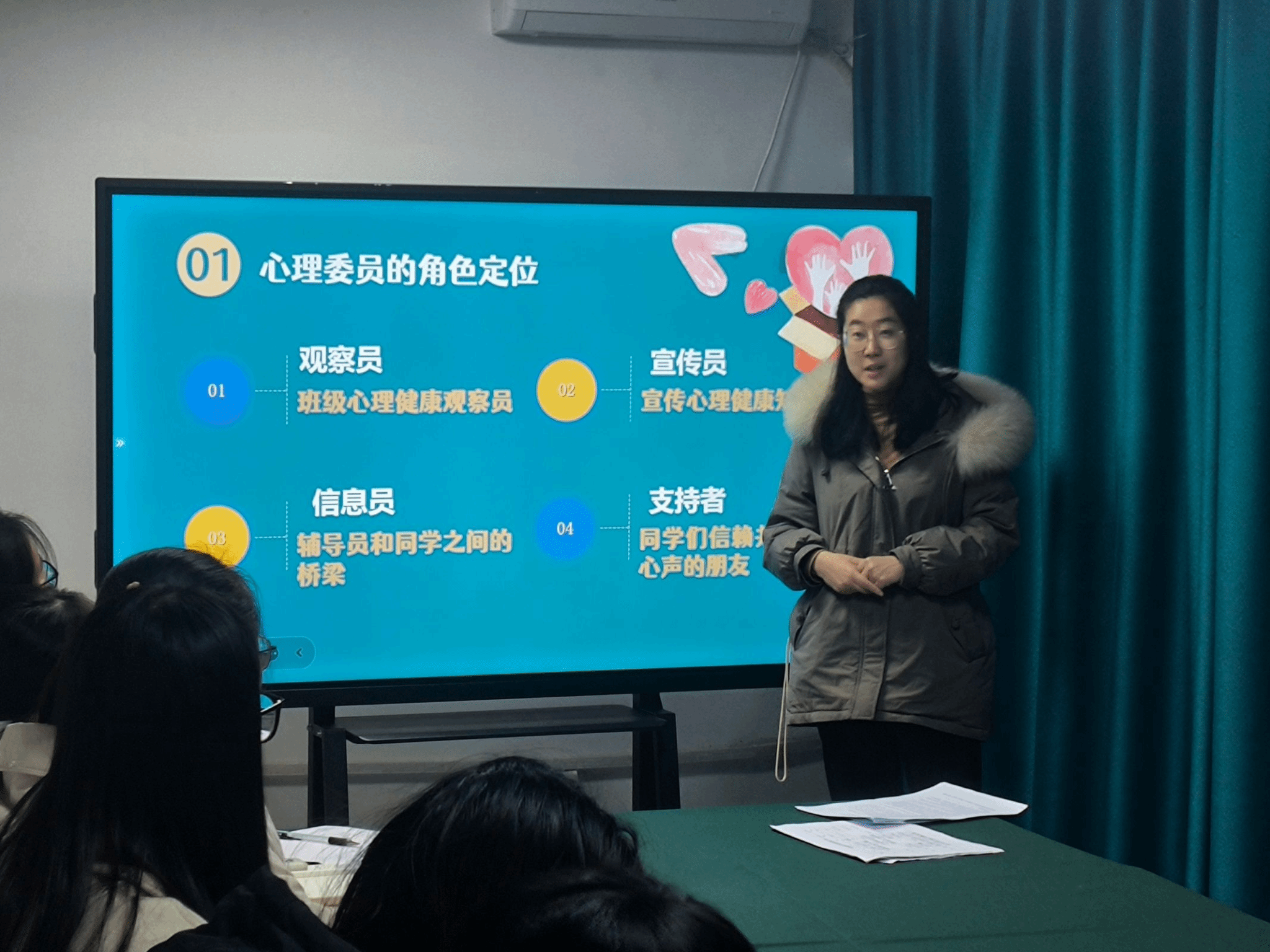 王思媛从心理委员的角色定位出发,向大家阐述了心理委员的四种角色,分别是观察员、宣传员、信息员、支持者。并抛出“如何塑造一个让人信赖的朋友形象”这一引人深思的问题。对此,她以简洁而深刻的答案—“用心做事、真诚待人”,进行了精辟的阐释。同时,王思媛向大家分享了一系列有助于班级心理委员工作的技巧,即关注学生心理动向、情绪动向,参与危机预警、预防,积极学习心理健康知识,并运用实际。王思媛以其严谨的工作态度和高度的责任感,不仅向我们传授了高效的工作方法,更以身作则,为心理委员树立了一个学习的典范。