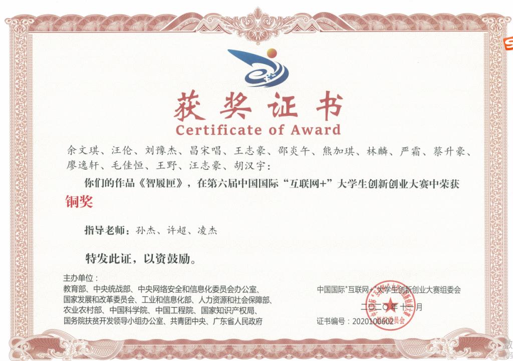近日,由教育部等12部委和广东省人民政府共同主办,华南理工大学和广州市人民政府、深圳市人民政府联合承办的第六届中国国际“互联网+”大学生创新创业大赛落下帷幕。经过激烈角逐,与众多双一流高校同台竞技,我校孙杰、许超、凌杰老师指导大学生申报的《智履匣》作品荣获全国铜奖,取得学校在该项赛事上的历史性突破。