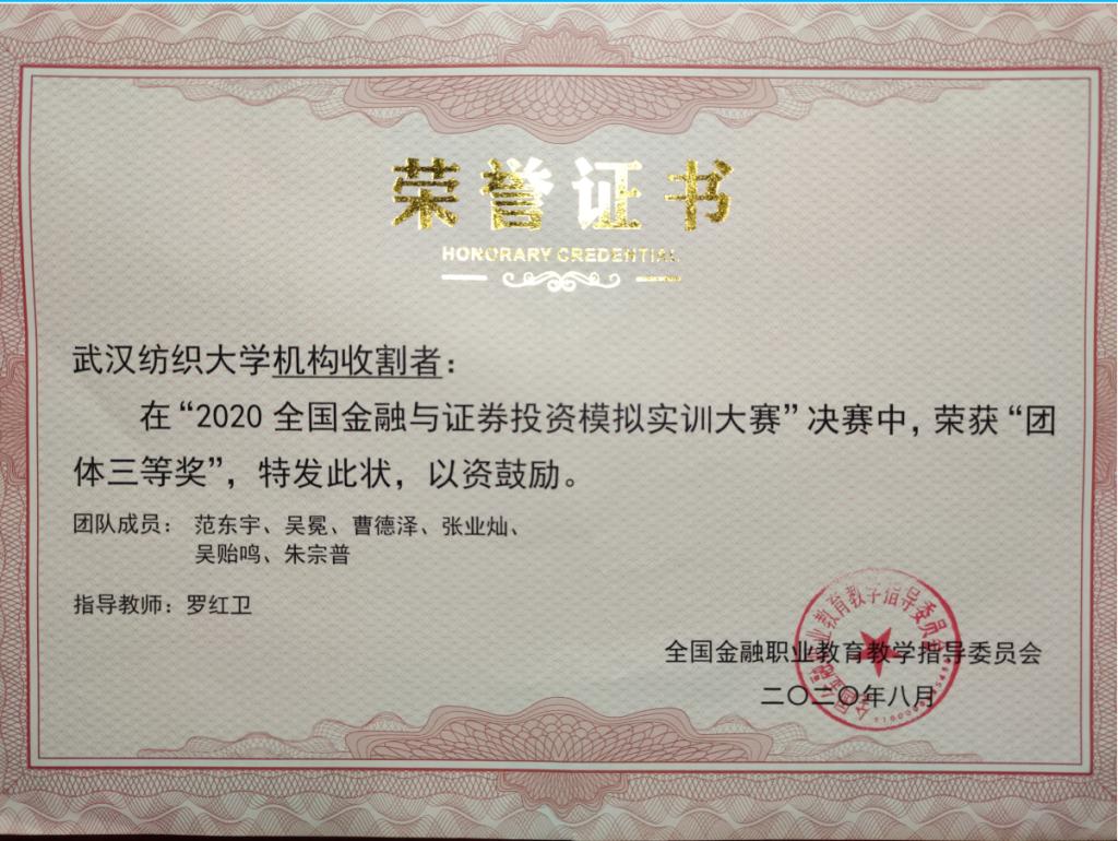 近日,由全国金融职业教育教学指导委员会主办,深圳希施玛数据科技有限公司承办,中国财经数据创新研究院协办的2020全国金融与证券投资模拟实训大赛落下帷幕。1066vip威尼斯组成的学生团队“纺大队”和“机构收割者队”,在罗红卫老师的指导下,经过激烈角逐,在决赛中荣获团体一等奖、三等奖。