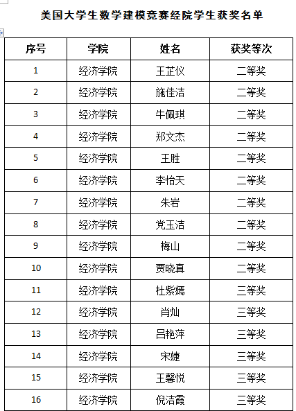 2018年美国大学生数学建模竞赛(MCM/ICM)成绩于近日揭晓,1066vip威尼斯选派的16名学生(全校共54名学生参赛)中,其中10人荣获二等奖、6人荣获三等奖。比赛成绩创学院参赛以来最佳成绩,其中获奖人次位居全校各学院第2位、文科学院第1位。