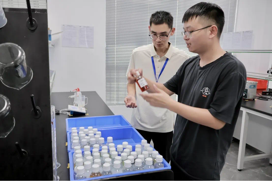 实践队首站来到校友企业——广东润祥精细化学有限公司。公司总经理柳晓山带领师生走进智能化生产车间,现场演示低温精炼剂、无氟防水剂等纺织印染助剂产品生产流程。“我们把最新科研成果直接搬进生产线,使生产能耗降低30%。”柳晓山表示,在内循环牵引下,依托国内超大规模市场,企业持续加大原创助剂的研发投入。在实践调研中,团队了解到公司所在地为广东省专业化工园区——江门市珠西新材料集聚区,是一家集研发、应用、生产、销售一体的纺织化学品科技型企业。“让每一滴化学助剂都成为绿色纺织的加速器。”柳晓山用这句话为润祥做了最简洁的自画像,也为实践队后续调研提供了鲜活的样本。