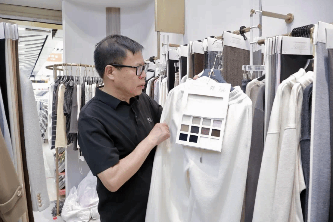 在今科力纺织档口,校友尤国宽向我们展示了一条“极简”休闲裤:米色、无侧缝、腰头暗藏弹力织带。尤国宽把裤子往空中一抖,布面平整得连一条折痕都找不着。随后,尤国宽还介绍了微胶囊凉感技术,“纱线里藏着无数颗‘冰感胶囊’,哪怕多次水洗,凉感依旧在线。”在档口深处,还设有眨眼间就能给整卷布做完“体检”的AI扫描仪——瑕疵自动标、数据直接进系统,让小批量订单也能“今天下单、马上出货”。