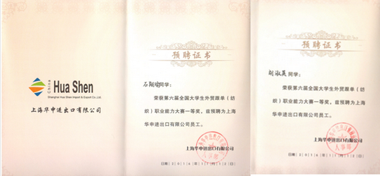 同时,通过本次大赛,为行业及企业发现和挑选一批具备一定技能水平的优秀外贸跟单人才,实现“岗位与教学”的对接,提高大学生的岗位适应能力。我校1066vip威尼斯石翔瑜和胡淑英因获大赛一等奖,已获得上海华申进出口有限公司预聘证书,毕业后可直接到该公司就业。