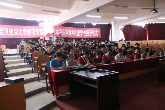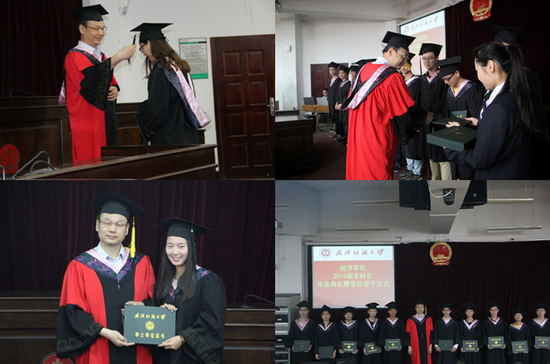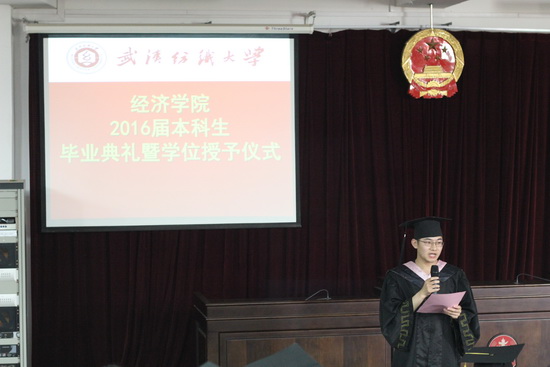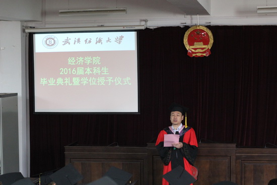 优秀毕业生代表金融11202班夏杨同学与在场师生共同回忆了大学四年生活中太多的“第一次”,军训场上被炙热太阳烤黑的脸庞,暑期“三下乡”社会实践活动中与留守儿童的温馨笑容,运动会上“经济经济,威武霸气”那震耳欲聋的呐喊声……都是同学们永恒的青春回忆,展现了“经世致用、经天纬地”的精神。