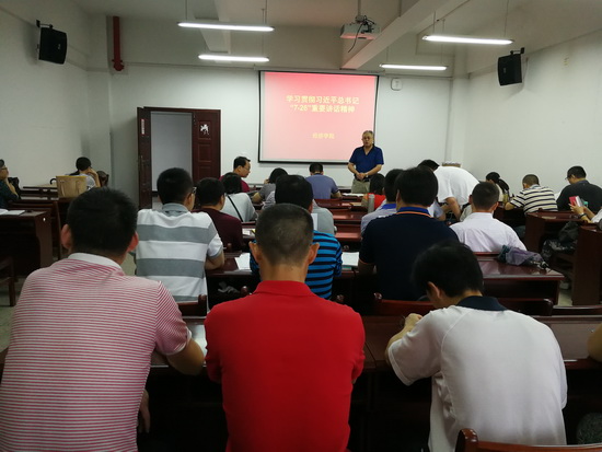 在庆祝第33个教师节之际,1066vip威尼斯组织新学期全体教师大会,专题学习习近平“7.26”重要讲话精神。会议由学院党委毛长文书记主持,国贸学生党支部负责人张悦同学进行专题学习宣讲。