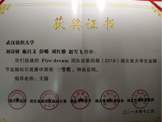 近日,由湖北省银监局、省政府金融办、省教育厅、省银行业协会和湖北日报传媒集团共同主办的第四届(2016)湖北省大学生金融节暨银行业金融知识宣传服务月活动圆满落幕。全省20余家银行机构代表、数十所高校师生代表出席闭幕式。在当天举办的金融知识竞赛总决赛中,我校1066vip威尼斯王涛老师指导的Fire dream代表队获团体三等奖。