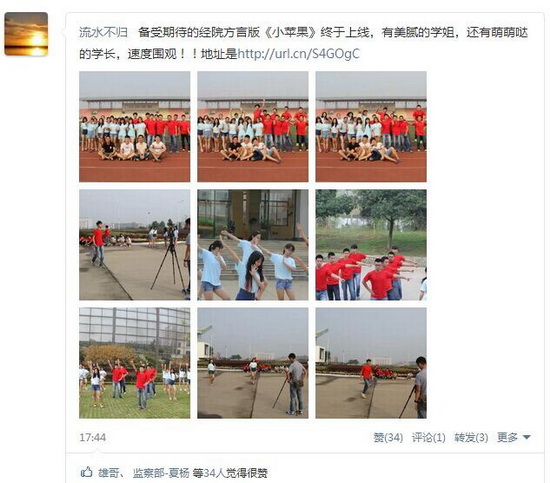 截至11日早上6点,微博已被阅读5735次,优酷网视频播放2598次。这部方言版《小苹果》汇集了浙江、广东等8种各地方言,诙谐幽默,学校大门、图书馆、大学生活动中心等标志性建筑也得到了集中体现。
