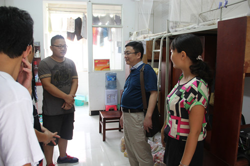 熊书记一行每到一间宿舍首先关心学生们暑期的生活状况和学习状况,仔细询问是否还有生活和学习上的困难,嘱咐一定要劳逸结合,加强身体锻炼,同时提醒他们注意身边安全,提高安全意识。同学们对学院领导的慰问和关怀表示谢意,感谢学院老师在酷暑中为他们送来慰问品,送来清凉的关怀,他们将继续努力加油,在学习中不断突破创新,为学院争创荣誉,为学校再创佳绩。