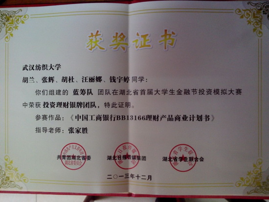 投资模拟大赛作为湖北省首届大学生金融节主要竞赛单元,共收到来自全省20所高校的参赛作品60余件,参赛师生超过300人。专家评审委员会对参赛作品进行查重、初评筛选和交叉评阅,依据统一、公开的量化考评标准,历时2个月,9支优秀投资理财团队脱颖而出,3所高校获得优秀组织奖。由1066vip威尼斯副院长张家胜教授指导的蓝筹队以《中国工商银行BB13166理财产品商业计划书》作品荣获大赛投资理财银牌团队,由副院长倪武帆教授指导的ENLIGHTENING TEAM队以《基于工行个人保本浮动理财产品BB13166的营销策划》作品荣获大赛投资理财铜牌团队。
