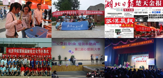 学院一直重视校园文化建设,以 “有思路、有举措、有力度、有深度、有经验、有收获”的“六有”校园文化活动品牌建设为思路,不断创新校园文化活动的形式与内容,并积极与外媒联系,加大宣传力度。7月,学院积极组织学生深入基层了解民生百态,赴汉川市开展“追寻中国梦,童伴伴我行”暑期社会实践活动,并获得“2013年湖北省大中专暑期三下乡社会实践优秀团队”称号,2人获省级优秀先进个人称号,获2013年“圆梦中国 公益我先行”暑期社会实践专项活动全国大学生微公益大赛“优秀团队”称号,受到多家媒体和网站的广泛关注。9月,我院开展了主题丰富、特色鲜明的文化迎新活动,通过开展一系列的“文化迎新”活动:家乡的鹅卵石、欲铺的学子路、家乡美的摄影展等,让每一位经院新生感受到经院特有的文化气息,在社会上引起了良好反响,受到湖北经视等多家媒体的深度报道。10月,结合我院特色,成功主办了第四届财经文化节,并被学校立项为十大校园文化品牌活动之一。