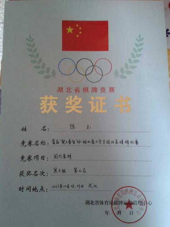 为了丰富湖北省高校大学生课余生活,加强高校间的体育文化交流,由湖北省国际象棋协会主办、武汉睿智国际象棋俱乐部承办的首届“睿智杯”湖北高校国际象棋锦标赛于12月28、29日两天,在武汉体院银湖宾馆举办。我校经济学子陈玉同学经过两天七轮的激战,过关斩将,荣获比赛男子组第七名。