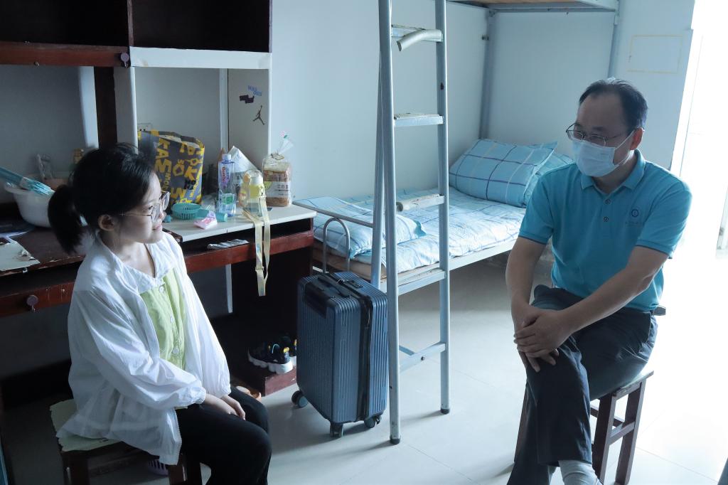 9月9日,学院院长段丁强,党委副书记李静宇及2022级辅导员马晓雪亲切慰问12A605寝室学生周梓镘。在了解到学生是第一次离家求学后,段丁强鼓励其迎难而上,顶住压力,保持充足的精力去享受这段珍贵的人生经历,并仔细叮嘱要时刻注重身体健康与安全。随后,段丁强表示,学院以“一床被褥”、“一箱牛奶”聊表心意,期待未来的她“不坠青云之志”。围绕“学业”与“生活”两方面,李静宇就其提出的疑难问题作了详细解答。周梓镘向老师表达感谢,学院的深切关心令初入陌生环境的她倍感温暖。