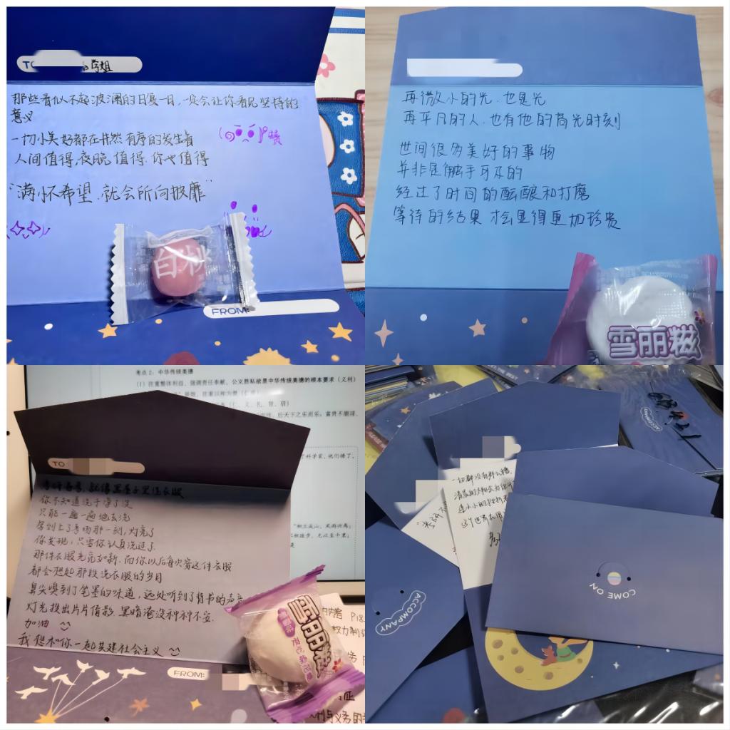 12月20日,学院组织为留校考研学生分发了精心准备的“考研暖心助力加油包”,“暖心助力加油包”中含有:“暖手更暖心”——暖水袋、心想事“橙”——橙子、文星高“罩”——防护口罩、“研”途“经”彩——手写明信片、百事可乐等,处处都体现着“实用”与“用心”,饱含着学院对考研学生的深情祝福。学院为此次慰问活动做了充分准备工作,提前联系进行了物资采购,并号召学院领导、辅导员、学弟学妹们为考研学生亲笔书写了祝福明信片。在尽量减少接触、符合防疫要求的前提下,有序组织了“暖心礼包”的发放工作。