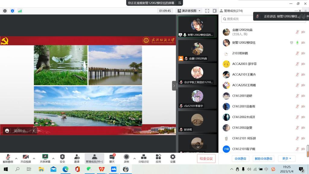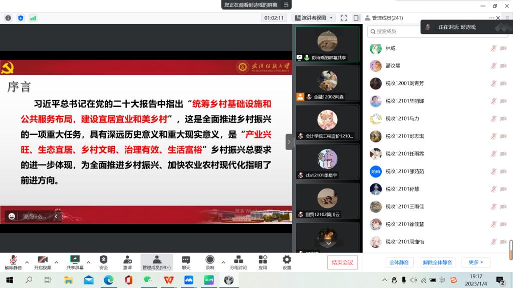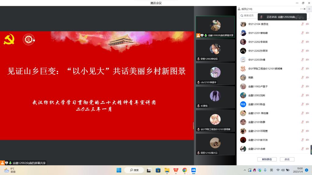 为进一步组织引导广大青年学生深入学习宣传贯彻党的二十大精神,坚定跟党走、建功新时代。根据《1066vip威尼斯学习贯彻党的二十大精神宣讲工作方案》部署要求,1月5日晚,学校青年宣讲团第六分团深入1066vip威尼斯、会计学院,通过腾讯会议线上平台面向两院青年学子开展党的二十大精神专场宣讲报告会,近300名青年师生参加报告会。