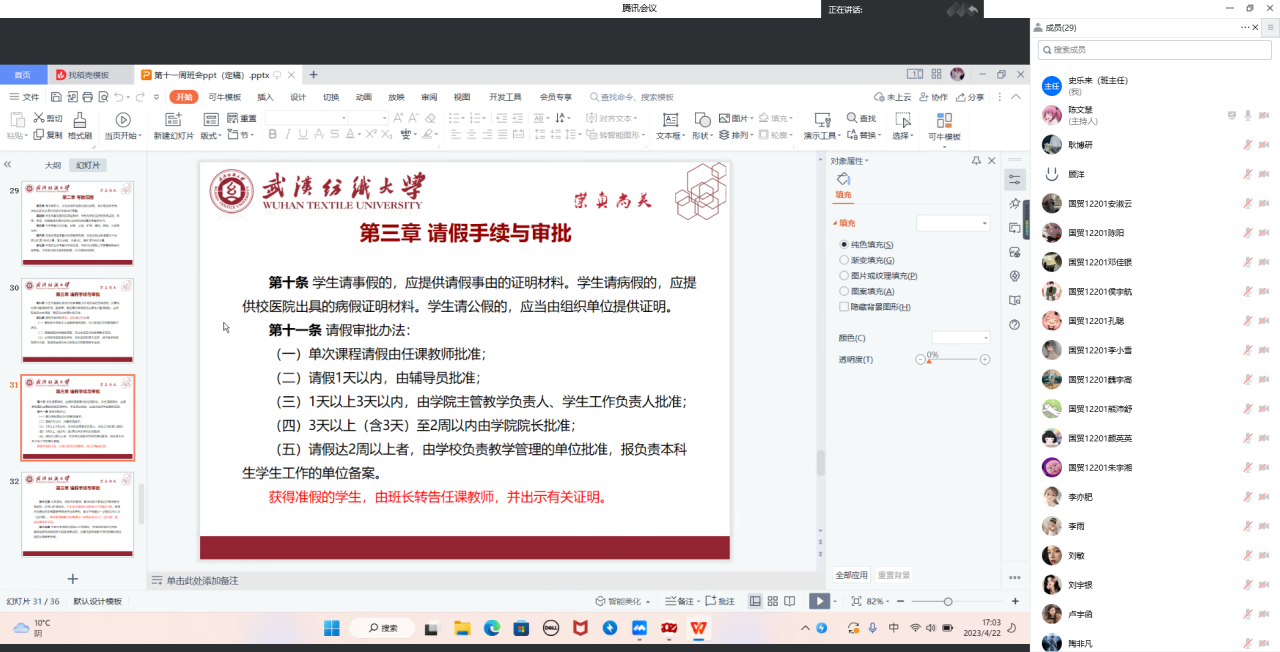 根据学校及学院相关工作安排,4月22日晚,学院全体辅导员、班主任通过线上线下相结合的方式,以班会或年级大会等形式深入各班级组织召开晚点名,了解学生状态,开展“弘扬劳模精神、劳动精神、工匠精神,激扬青春活力、青春风采、青春力量”主题教育,学院全体本科生、研究生参加班会。