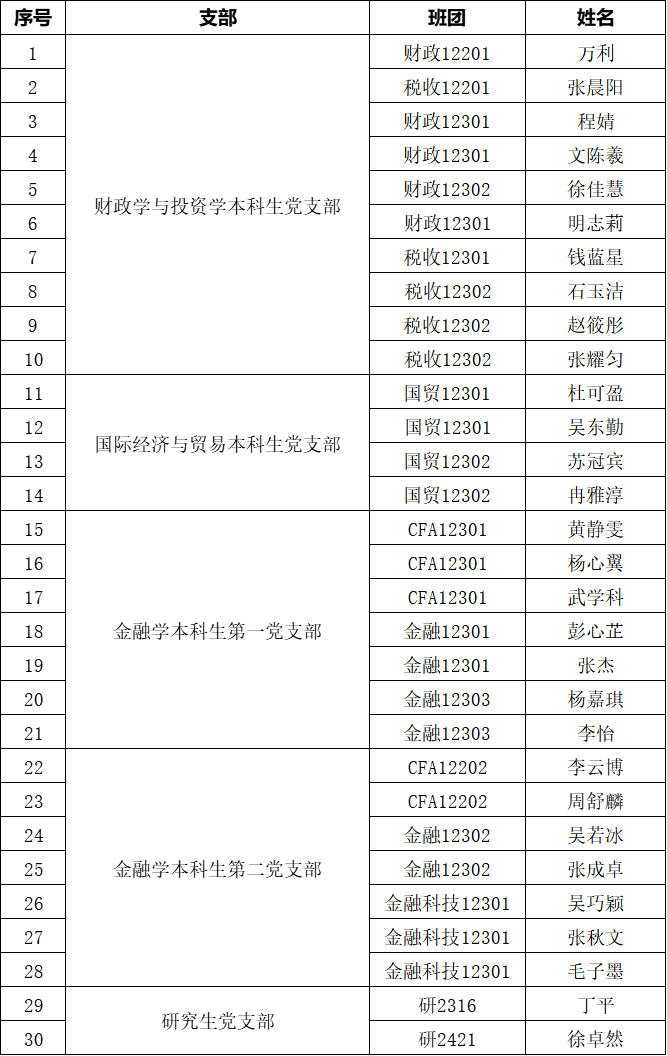 根据《中国共产党章程》和《中国共产党发展党员工作细则》规定,经基层团学组织推荐、综合考评考察、党支部审议、学院党委审查决定,拟将以下30名学生列为发展对象,现予以公示:
