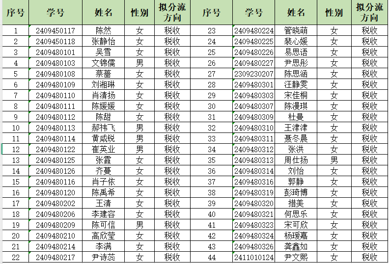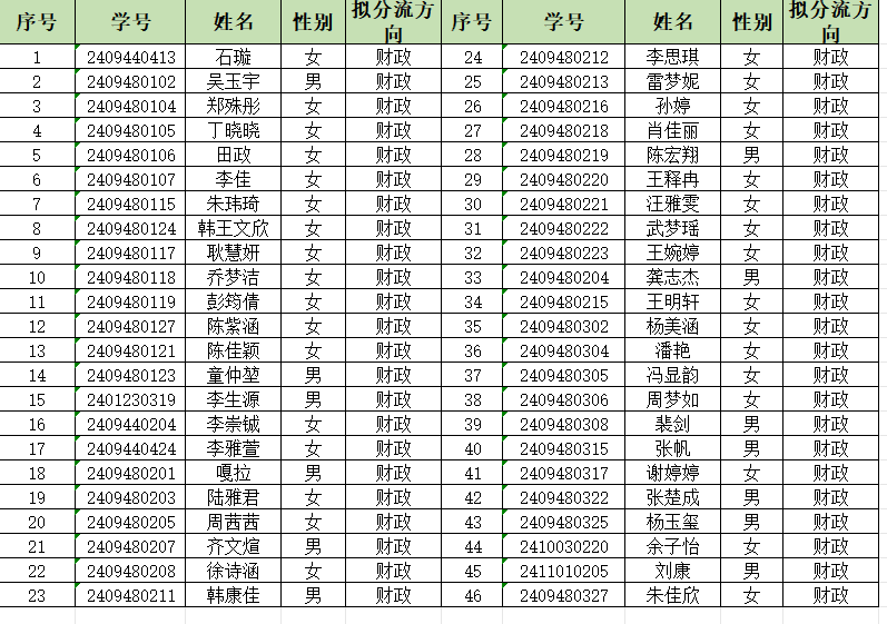 按照专业分流方案,2024级财政学类专业分为财政学和税收学两个方向,经学生自愿报名,石璇等46人进入财政学方向,李崇铖等44人进入税收学方向,详细名单如下: