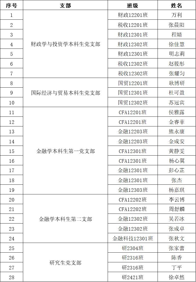 根据《中国共产党章程》和《中国共产党发展党员工作细则》,按照发展党员工作有关规定,经各学生党支部委员会研究和学院党委审核,拟确定以下28名同志为预备党员,现予以公示: