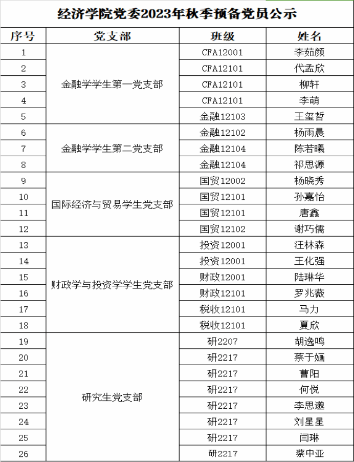 根据《中国共产党章程》和《中国共产党发展党员工作细则》,按照发展党员工作有关规定,经支部委员会研究和学院党委审核,拟确定以下26名同志为预备党员,现予以公示: