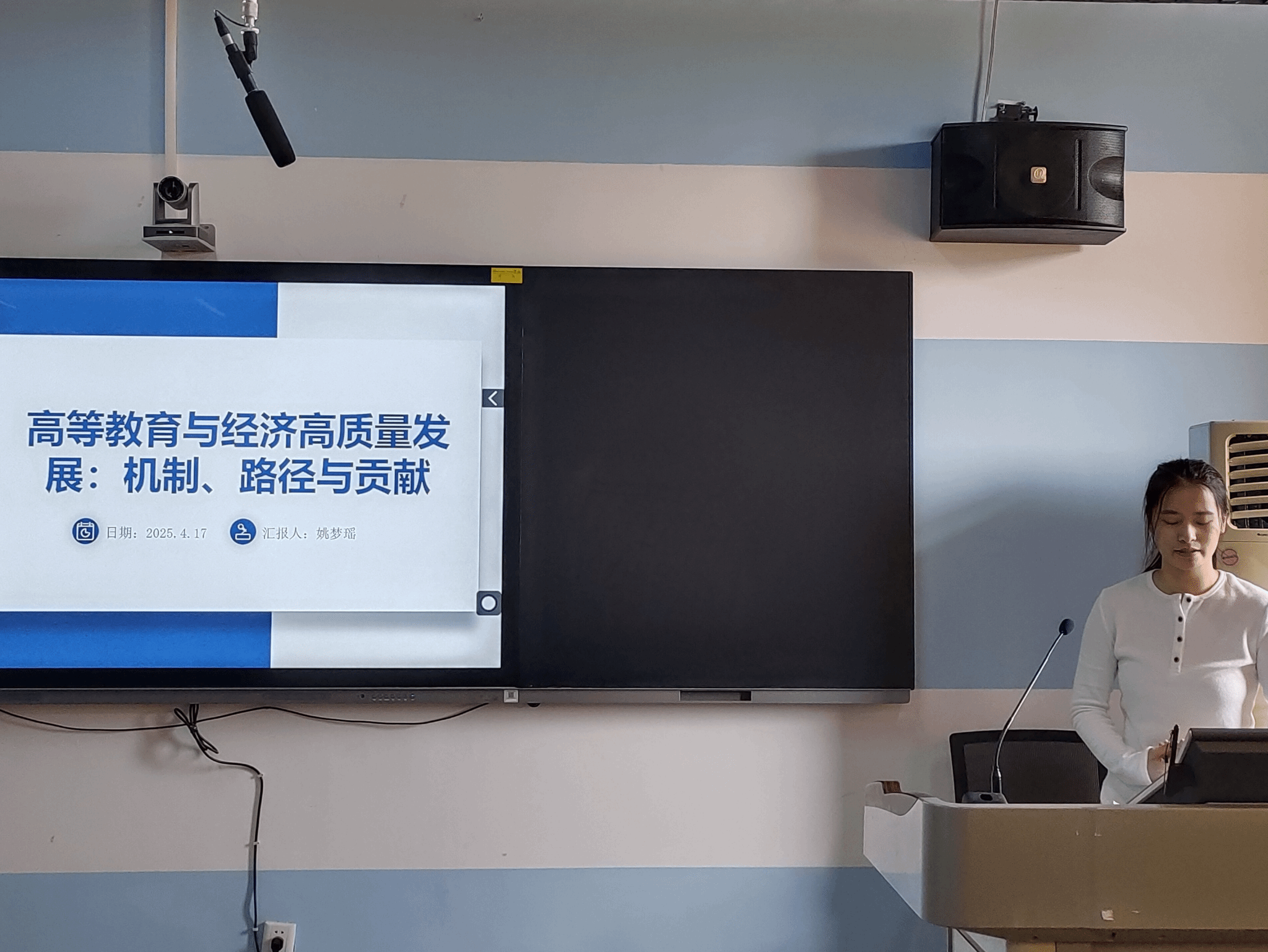 论坛上,六位主讲人依次登台,分别围绕近期学术研究成果进行汇报。林坤同学以《农产品区域公用品牌对于农民收入的影响研究》为题,深入探究了农产品区域公用品牌提升农民收入的作用路径,并规划后续的研究计划。范欣瑶同学以《耐心资本对企业新质生产力的影响》为题,通过理论分析与实证研究,揭示耐心资本驱动企业新质生产力提升的内在机制与实际效应。黄唯卉同学以《数字普惠金融对制造业企业新质生产力的影响》为题,深入探讨了数字普惠金融如何推动制造业企业新质生产力的提升,为产业升级与经济高质量发展提供了新的思路与理论支持。张浩然同学以《新质生产力背景下数实融合的深度与广度测算》为题,通过梳理相关理论,结合实际案例,运用合适的方法对新质生产力背景下数实融合的深度与广度进行测算和分析。丁文龙同学以《数字金融与企业金融化》为题,通过数据收集与分析,探讨数字金融发展对企业金融化趋势的影响与内在关联。姚梦瑶同学以《高等教育与经济高质量发展:机制、路径与贡献》为题,运用实证分析方法,系统探究了高等教育驱动经济高质量发展的内在机制、可行路径及实际贡献度。