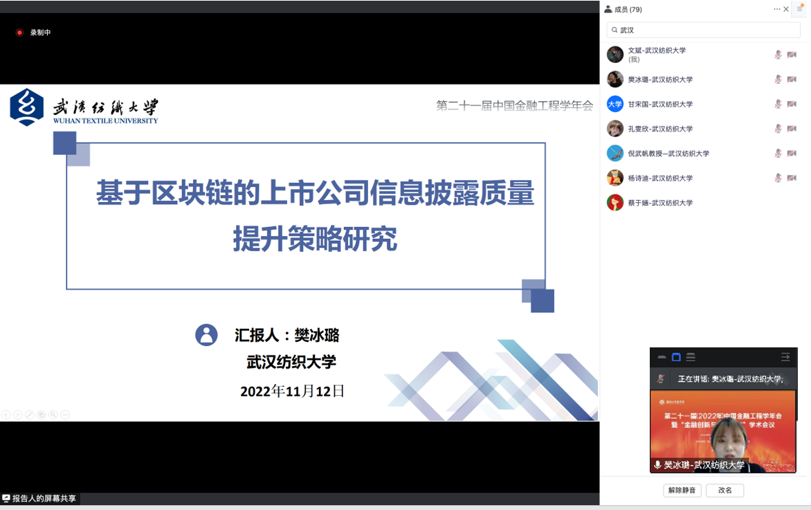 倪武帆教授与研究生文斌、樊冰璐等共同完成的学术论文《基于区块链的上市公司信息披露质量提升策略研究》成功入选,并受邀参加本届年会,樊冰璐代表项目团队在学术论坛上作了主题报告和发言。11月12日下午,樊冰璐在主题为“资本市场与风险投资”的分会场进行了项目研究的成果展示,并就相关研究的背景、方法、技术路线、实证结论等内容作了专题报告。该研究成果以提升企业信息披露质量为目的,揭示了影响信息披露质量的因素,剖析了重要信息虚假披露、负面信息隐瞒披露、无效信息过度披露等诸多信息披露质量问题,提出了运用去中心化技术、分布式账本、智能合约技术、溯源时间戳等对策。樊冰璐的报告精炼、流畅,得到了与会专家的一致好评。同时,樊冰璐还作为点评嘉宾,点评了《金融工程“优质数字金融科技人才”跨专业培养模式的研究》专题报告,在点评分析环节中,结合我校实践,樊冰璐分享了我校1066vip威尼斯在本科层次有关金融科技方向、CFA方向、金融学双学位的办学经验,在研究生培养过程中充分运用中信证券研究生工作站、长江成长资本股份有限公司研究生工作站、金融数学研究院(筹)等学术平台、实践实训平台提升培养质量的创新做法,得到与会专家学者充分肯定和积极评价。