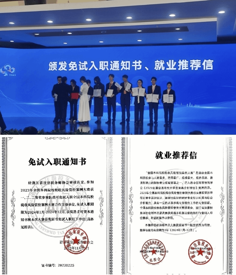在总决赛中,我院学子以扎实的专业知识、高质量的案例作品与优异的现场表现获得了行业评审专家的高度认可。浙江省注册税务师协会行业党委常务副书记、会长邢幼平在现场直接为获奖选手们颁发了免试入职文件与就业推荐信,选手们获得了十余家税务师事务所的免试入职机会。