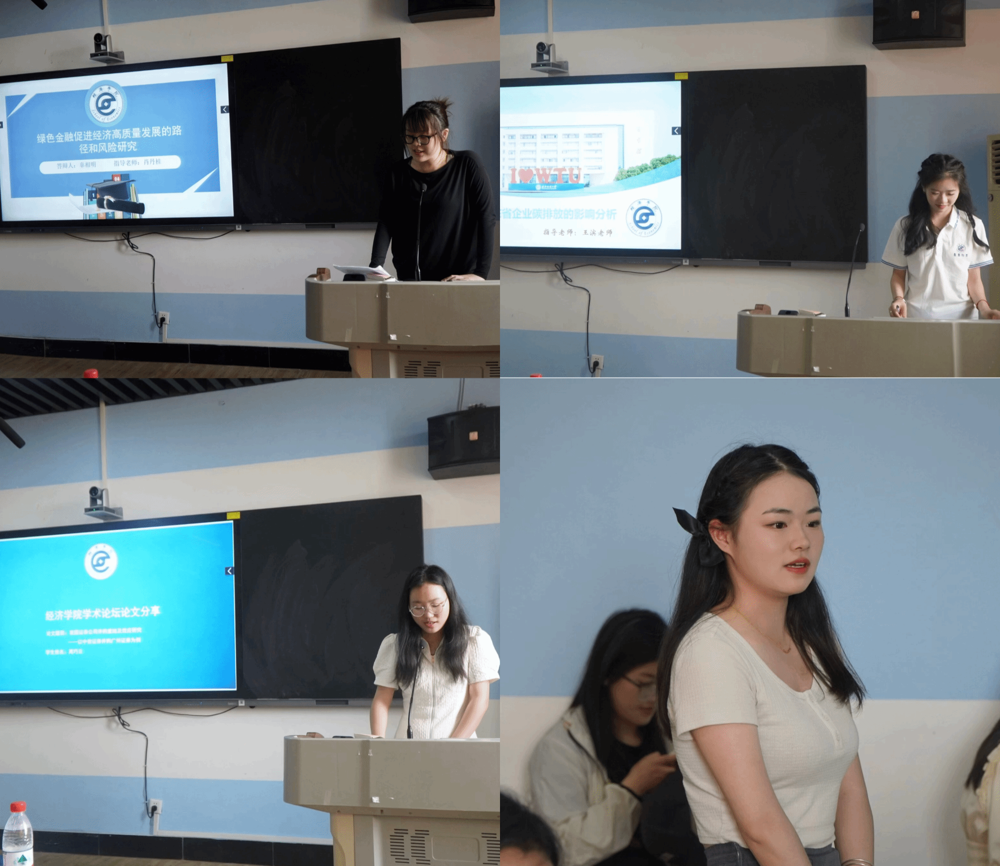 随后,七位答辩人分别从研究依据、研究意义、研究思路、研究成果等方面做主题报告分享。王心雨利用检验与分析的方法,通过研究“营改增”对企业创新绩效的影响,提出相关结论和政策建议,并对论文创新点与不足进行分析;邓舒莛基于我国现有财政政策及环保产业的现状,结合国内外文献资料,详细介绍了我国环保产业发展的利弊;周巧云以中信证券并购广州证券为例,阐述了我国证券公司的并购历程、并购动因及并购效应,并分享了在战略规划、并购时机等方面的启示和建议;吴卓令围绕服务贸易竞争力的发展现状,探讨了数字贸易壁垒对我国服务贸易竞争力的影响和对策,同时对贸易竞争力的未来发展进行了预期展望。评审老师对各位主讲人的汇报进行点评,充分肯定了他们的成果和能力。最后,老师们为优秀主讲人颁发证书奖品,并合影留念。