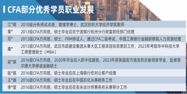 l 其中专业课程所配备的师资均是金融行业内专业人士,让学生不出校门,即可获得中英双语环境下国际金融分析师教育的宝贵机会,进而为未来争取进入金融机构或更广阔的就业平台,以及申请海外留学打下坚实的基础;