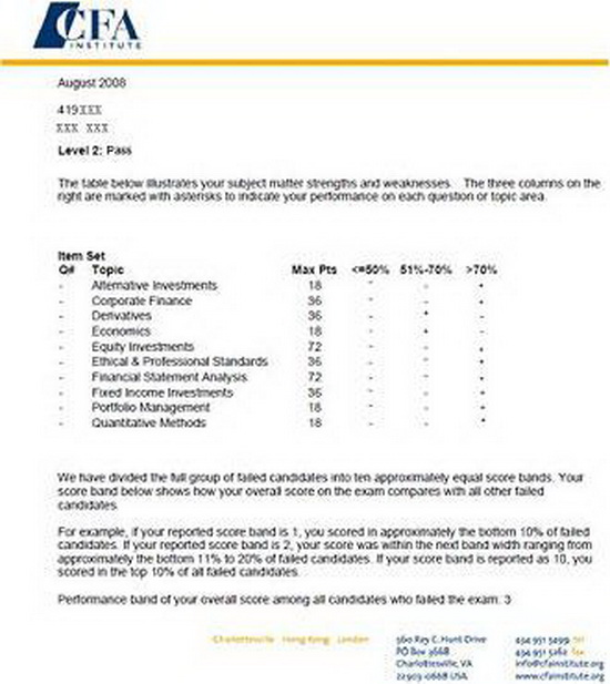 3.评分体系: CFA考试中会对各个科目单独评分,每个科目的成绩分为三档:< ="50%、51%-70%、">70%.CFA协会会把考生各个科目成绩汇总做加权平均,从而评判考生是否能通过考试;