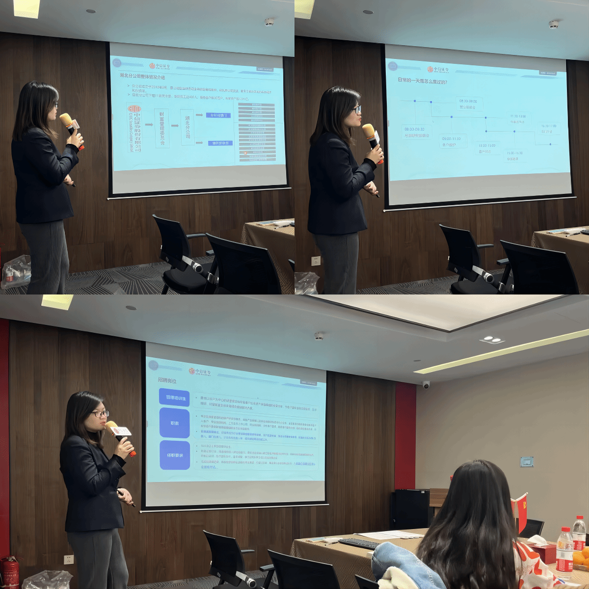 紧接着是肖芳经理针对企业招聘的具体细节介绍。她提到,近年中信证券在营业收入、利润率、股东权益报酬率等财务指标的表现上逐年攀升,对人才的渴求也日益增强。武汉天地营业部面向广大毕业生开放管理培训生岗位招聘,以规程化的轮岗指导,提供充足的个人选择和优质资源,帮助毕业生在调整中明确个人定位。
