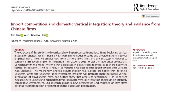 近日,1066vip威尼斯教师石小霞与研究生杜鑫在国际期刊Applied Economics(《应用经济学》)上合作发表了题为“Import competition and domestic vertical integration: theory and evidence from Chinese firms”(进口竞争与国内纵向一体化:来自中国企业的理论与经验证据)的研究成果。