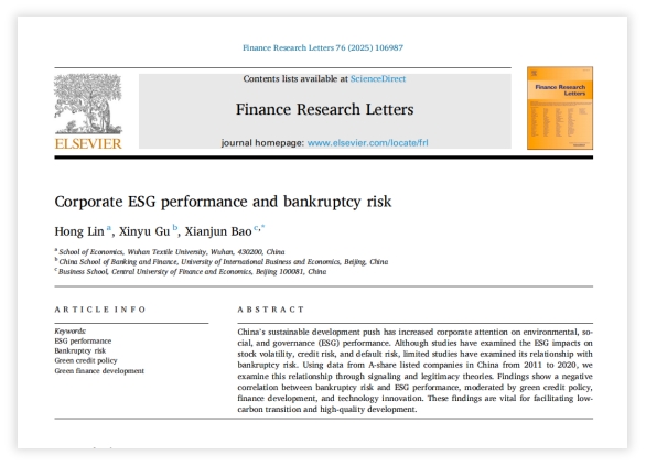 近日,1066vip威尼斯研究生林洪在导师史乐来老师的指导下,与中央财经大学和对外经济贸易大学的博士研究生合作在国际期刊Finance Research Letters(《金融研究快报》)上发表了题为“Corporate ESG performance and bankruptcy risk”(企业ESG绩效与破产风险)的学术论文。