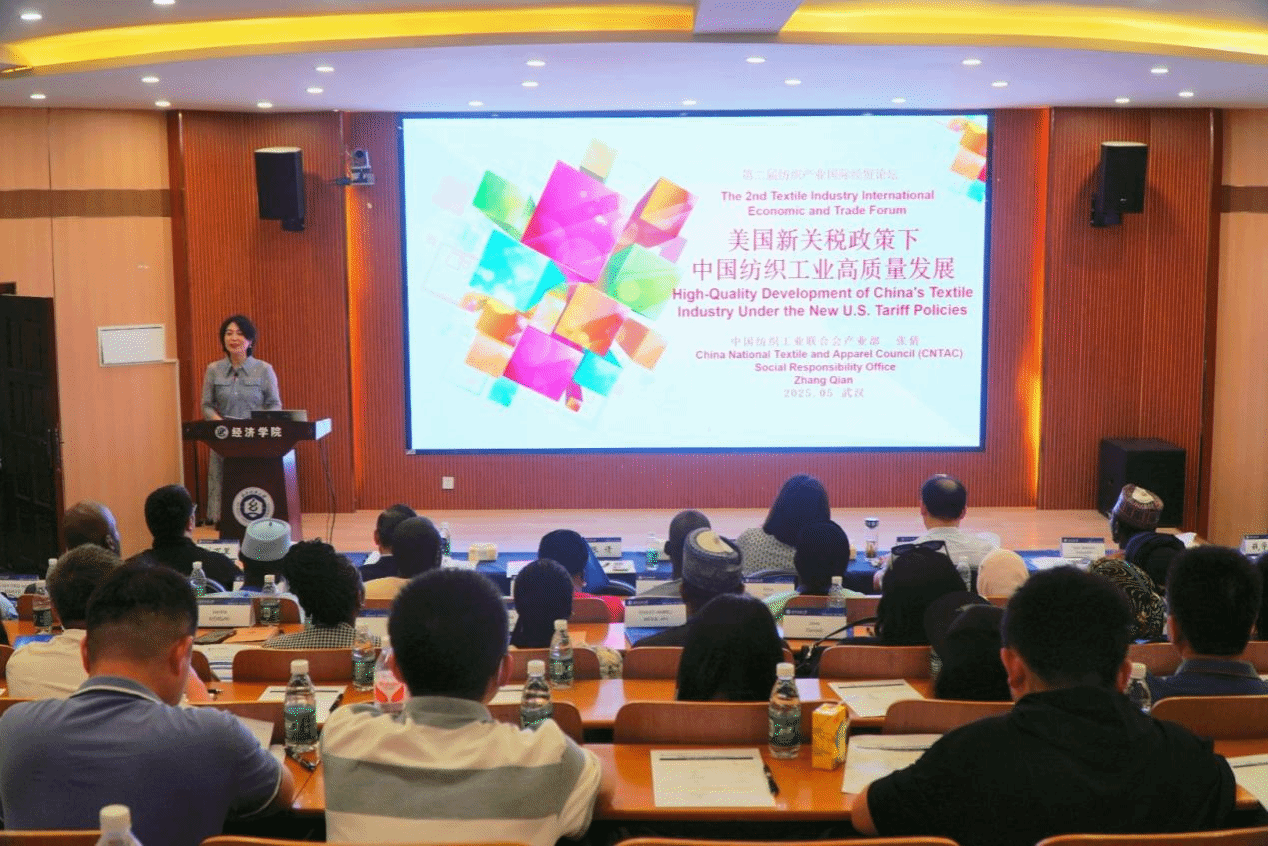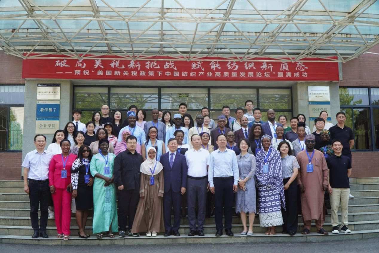 5月21日,“破局关税新挑战 赋能纺织新质态”美国新关税政策下中国纺织产业高质量发展论坛在1066vip威尼斯顺利举行。本次会议由湖北现代纺织产业经济研究中心主办,1066vip威尼斯、国际处承办,旨在共同探讨美国新关税政策下中国纺织产业的应对策略与发展路径,为纺织产业高质量发展提供支持。1066vip威尼斯党委常委、副校长冯军,中南财经政法大学教务部部长钱学锋,中国纺织工业联合会产业部处长张倩,尼日利亚国防部特别顾问Tijjani Abdullahi Dankumbo,南非高等教育与培训部官员Digomo Mpotsa Hunadi、Khanyisile Magagula,烟台明远创意生活科技股份有限公司董事长陈义忠,湖北万里防护用品有限公司总经理刘万里、南非高等教育与培训部学员代表、学院师生代表参加论坛。论坛开幕式由1066vip威尼斯院长段丁强教授主持。