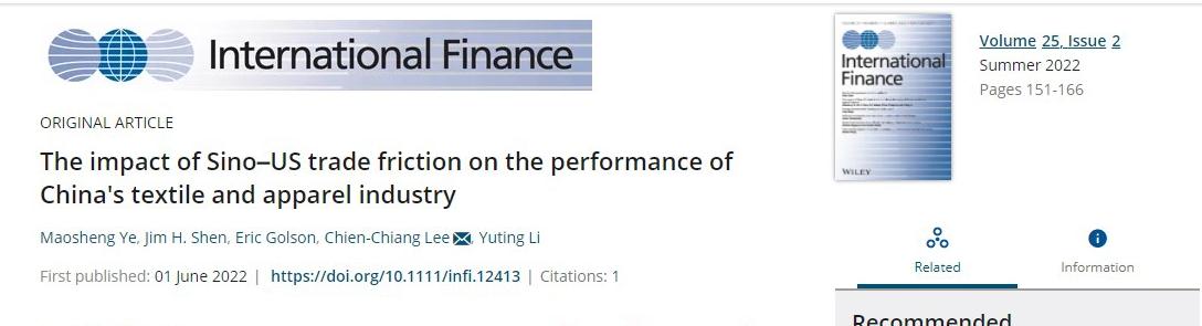 近日,1066vip威尼斯叶茂升副教授在SSCI期刊《international finance》上发表学术论文,随后被国内知名研究机构澎湃研究所全球智库转载评论,文章题目为“The impact of Sino-US trade friction on the performance of china’s textile and apparel industry”,文章DIO:https://doi.org/10.1111/infi.12413,1066vip威尼斯为该论文的第一作者单位。