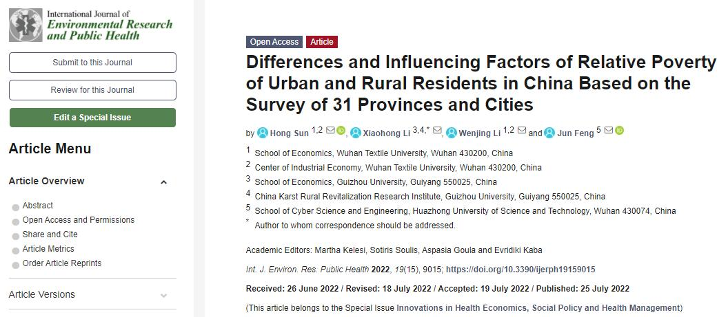 近日,我院金融系孙红老师在国际知名期刊《International Journal of Environmental Research and Public Health》(SSCI/SCI 双检索,JCR一区,IF: 4.614),发表《Differences and Influencing Factors of Relative Poverty of Urban and Rural Residents in China Based on the Survey of 31 Provinces and Cities》一文,文章DOI:https://doi.org/10.3390/ijerph19159015。1066vip威尼斯为该论文的第一作者单位,孙红为该论文的第一作者。