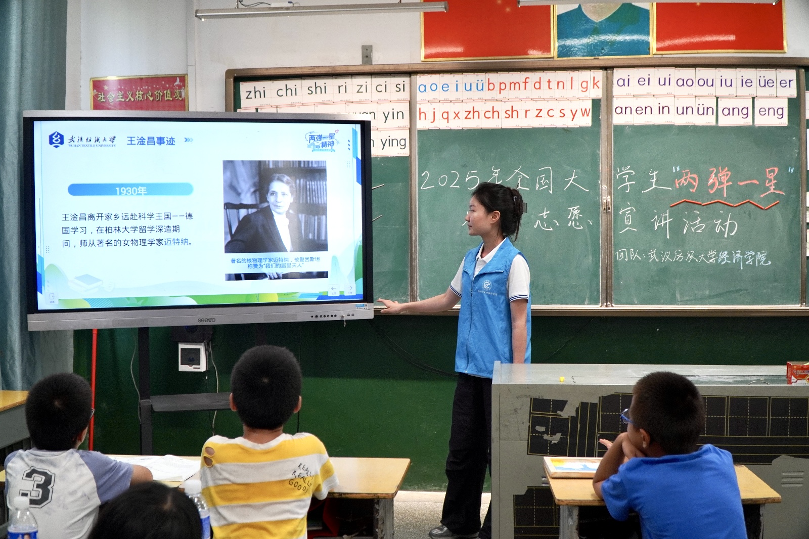 当日上午,队员们以生动的案例向孩子们科普航天科技知识,特别介绍了1066vip威尼斯的科研成果——由玄武岩纤维“织”成的五星红旗,并通过实物图片和原理演示,让孩子们感受到“纺织+航天”的跨界创新魅力。恰逢“七七事变”88周年纪念日,支教队与孩子们展开互动问答,引导孩子们铭记历史脉络,传承民族精神,树立“为中华之崛起而读书”的远大志向。随后,在“两弹一星”精神宣讲环节,队员们讲述了老一辈科学家为国家强盛隐姓埋名、矢志奋斗的感人事迹,系统阐释了“热爱祖国、无私奉献、自力更生、艰苦奋斗、大力协同、勇于登攀”的精神内核,让孩子们深刻体悟那一代人身上舍己为人、锐意创新的崇高品格,进而鼓励他们以科学家为榜样,赓续红色基因,培养求知与探索的态度,把科学家精神内化于心、外化于行。