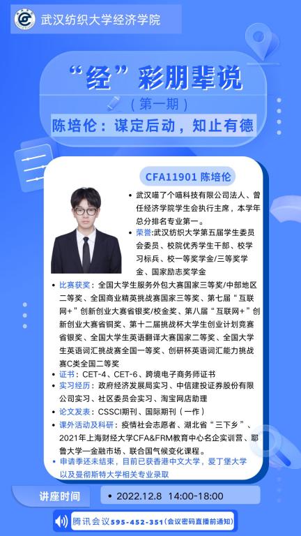 为发挥学生朋辈群体的先锋引领作用,营造良好院风、学风,12月8日下午,学院第一期“‘经’彩朋辈说”报告会通过线上腾讯会议平台进行。本次报告会特邀学院CFA11901班学生、喵了个喵武汉科技有限公司法人陈培伦主讲,学院各年级200余名本科生参加报告会。