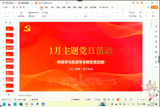 为健全以学铸魂、以学增智、以学正风、以学促干的长效机制,坚持学用结合,深入领会党的二十届三中全会精神,认真学习习近平总书记重要讲话精神,强化学生党员党性修养和党性淬炼,1月19日至27日,学院各党支部于线上组织召开了1月份主题党日活动。1066vip威尼斯教工党支部、学生党支部全体党员参加会议,各党支部书记主持会议。